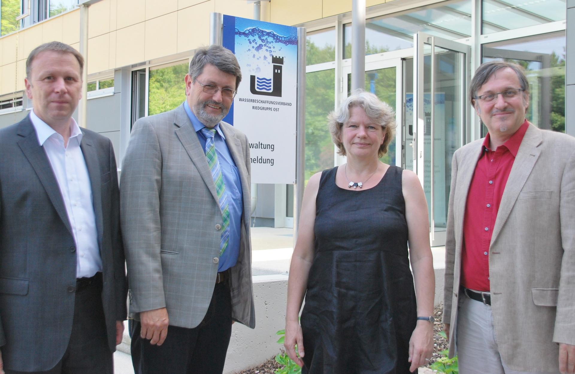 Zu einem Informationsbesuch weilte die Hessische Umwelt-Staatssekretärin Dr. Beatrix Tappeser im Wasserwerk Jägersburg, dem Sitz des Wasserbeschaffungsverbandes Riedgruppe Ost (WBVRO). Bild (v.l.):Verbandsdirektor Ingo Bettels, Klaus Schwab (Stellvertretender Verbandsvorsteher), Dr. Beatrix Tappeser und Verbandsvorsteher Markus Hirth. Bild: (WBVRO).