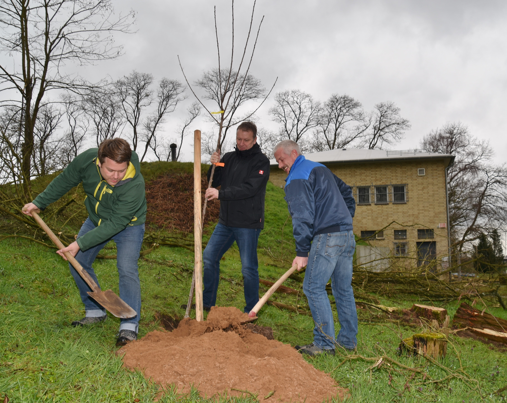 Neupflanzung: Auf dem Gelände des Wasserwerks Feuersteinberg werden Kirschbäume in die Jahre gekommene Robinien ersetzen. Florian Schumacher von den Streuobstwiesenrettern, WBVROVerbandsdirektor Ingo Bettels und WBVRO - Personalratsvorsitzender Peter Mehl (v.l.) pflanzten den ersten Kirschbaum. Foto: (WBVRO)