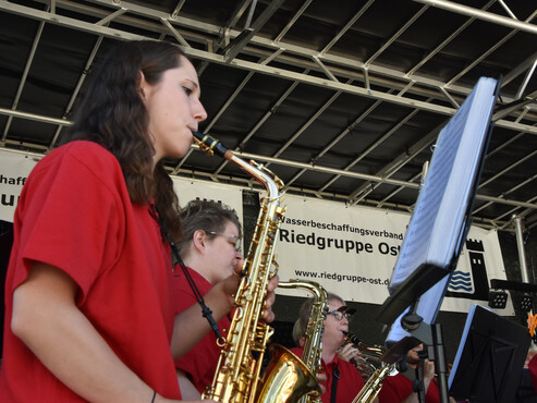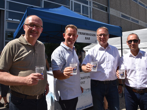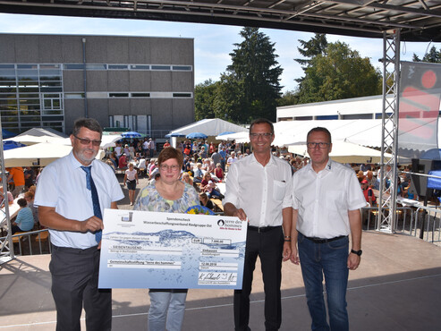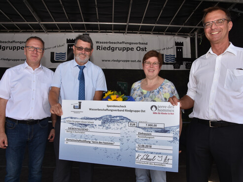 Auch zu seinem Jubiläum unterstützt der Wasserbeschaffungsverband Riedgruppe Ost gemeinnützige Projekte. Beim Tag der offenen Tür überreichten Verbandsvorsteher Klaus Schwab, dessen Stellvertreter Armin Kromer und Verbandsdirektor Ingo Bettels einen Spendenscheck in Höhe von 7000 Euro an Karin Lammers, Repräsentantin von „terre des hommes“. Das Kinderhilfswerk fördert weltweit Wasserprojekte für Kinder.