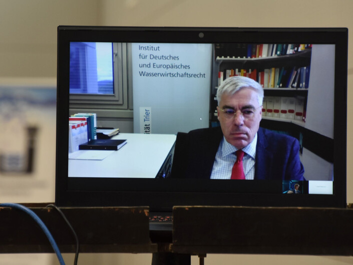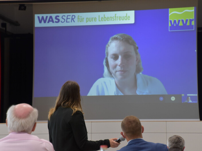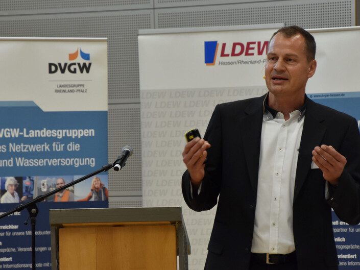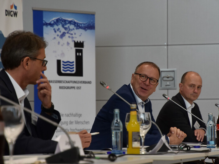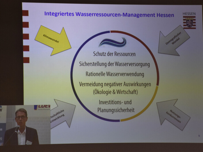 Prof. Dr. Michael Reinhardt, Direktor des Instituts für Deutsches und Europäisches Wasserwirtschaftsrecht an der Uni Trier erläuterte, wie der gesetzliche Vorrang der öffentlichen Wasserversorgung in der Praxis umzusetzen ist, in der anschließenden Podiumsdiskussion wurden Strategien und Instrumente zur Bewältigung des Klimawandels mit Jürgen Stein vom Klima- und Umweltministerium in Mainz, Dr. Bernd Leßmann vom Hessischen Landesamt für Naturschutz, Umwelt und Geologie, sowie Dr. Daniel Petry, vom DVGW in Bonn diskutiert.